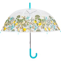 - At the push of a button, the canopy of this clear umbrella opens fully